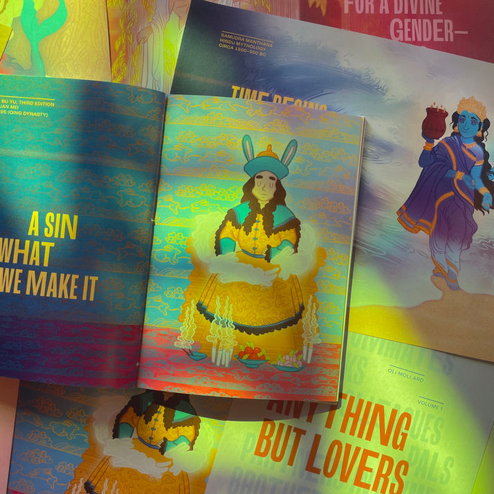 The hero spread for each story homages the historic art style from its country of origin, while also blending LGBTQ+ iconography and cultural colour theory.